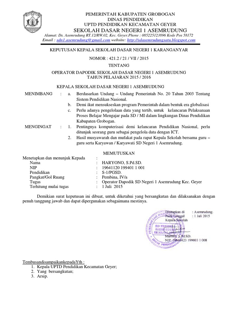 Contoh format sk terbaru dengan penugasan sebagai operator di tahun ajaran 2018 2019 secercah ilmu.