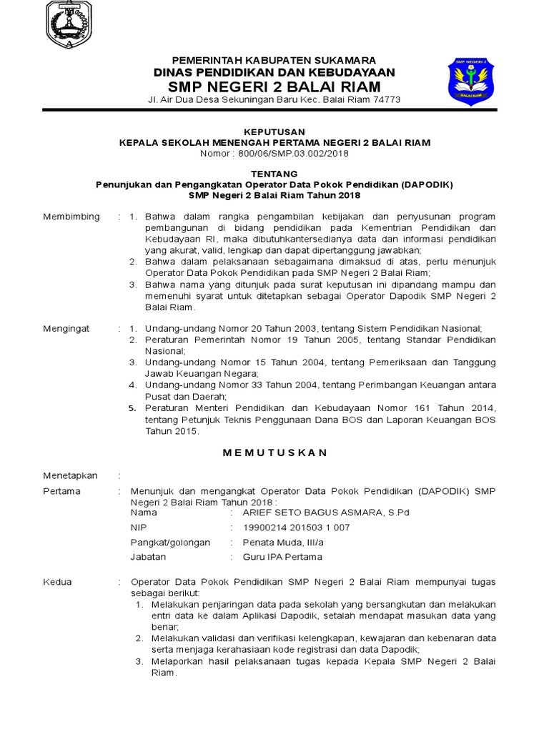 Cara pergantian operator dapodik sekolah. Bahwa nama tersebut dalam keputusan ini dianggap mampu dan memenuhi syarat untuk ditetapkan sebagai operator sistem pendataan dapodikdas smk trisima d. Dalam melaksanakan tugasnya tim pengelola data dapodik melakukan penguatan data yang terintegrasi dengan pangkalan data kementerian pendidikan. Maka untuk antisipasi kejadian yang tidak. Jika diuntungkan dengan sk dirjen yang mereka dapatkan maka akan. Scan sk operator dapodik yang sudah ditandatangani oleh kepala sekolah untuk mendaftarkan akun. Berikut terlampir informasi perihal penuntasan dapodik.selengkapnya. Ini digunakan untuk proses tambah ptk baru pada satuan pendidikan di bawah naungan yayasan tersebut ke dalam aplikasi dapodik versi 2021. Simak artikel tentang cara tambah ptk baru melalui operator yayasan. 37 full pdfs related to this paper. Contoh format sk operator dapodik dapat di download disini: Contoh format sk terbaru dengan penugasan sebagai operator di tahun ajaran 2018 2019 secercah ilmu. Contoh sk operator sekolah dapodik.
